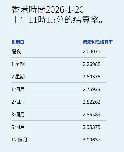 智通财经APP获悉,1月20日,港元拆息普遍下跌华夏理财,隔夜息报2.00071%,跌52.37基点;一周拆息跌1.417基点,报2.26988%,两周则跌0.048基点,报2.60375%。与楼按相关的一个月拆息连跌三日报2.75923%,跌1.75基点。